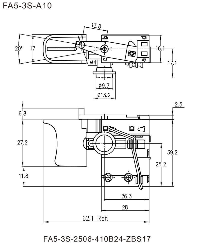 FA5-3S/FA5-6S 系列是一款通用型扳機電子調速開關,其中FA5-6S系列是升級款,可以承受更大的電流沖擊,集成防塵功能,廣泛應用于各類電動工具,如: 6mm電鉆、10mm電鉆、沖擊鉆、沖擊螺絲起子、電錘、曲線鋸、攪拌器、平板砂光機等, 也可用于吊磨機的腳踏開關等。開關有多種扳機、鎖鈕和撥桿可以選擇,也可以根據客戶要求進行定制。