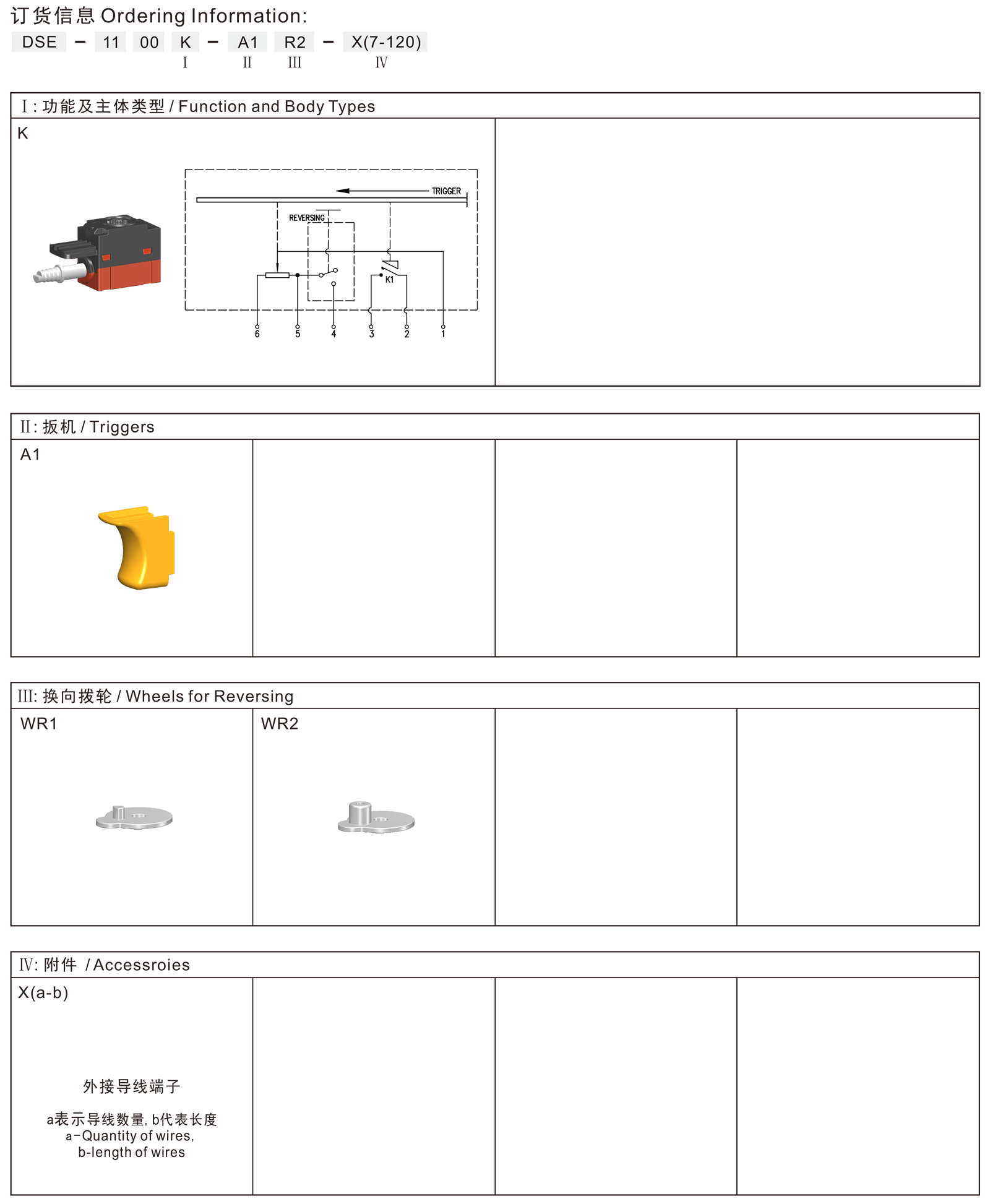 ◆DSE系列是一款專用型的直流信號(hào)扳機(jī)開(kāi)關(guān),集成防塵功能,是特別為直流無(wú)刷充電式電動(dòng)工具設(shè)計(jì)的,可適用于:無(wú)刷充電式電鉆、無(wú)刷充電式電錘、無(wú)刷充電式螺絲起子、無(wú)刷充電式?jīng)_擊扳手等。 ◆DSE series are one special type DC signal trigger switches, integrated dustproof, designed specially for used in Brushless DC power-tools such as: Brushless Cordless Drills, Brushless Cordless Screw Drivers, Brushless Cordless Impact Wrenches,etc.