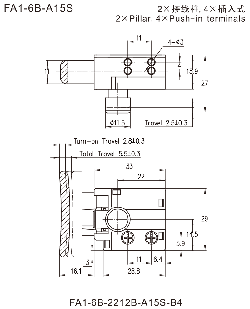 →2×接線柱端子 Pillar terminals φ=2.6mm or 2.8mm