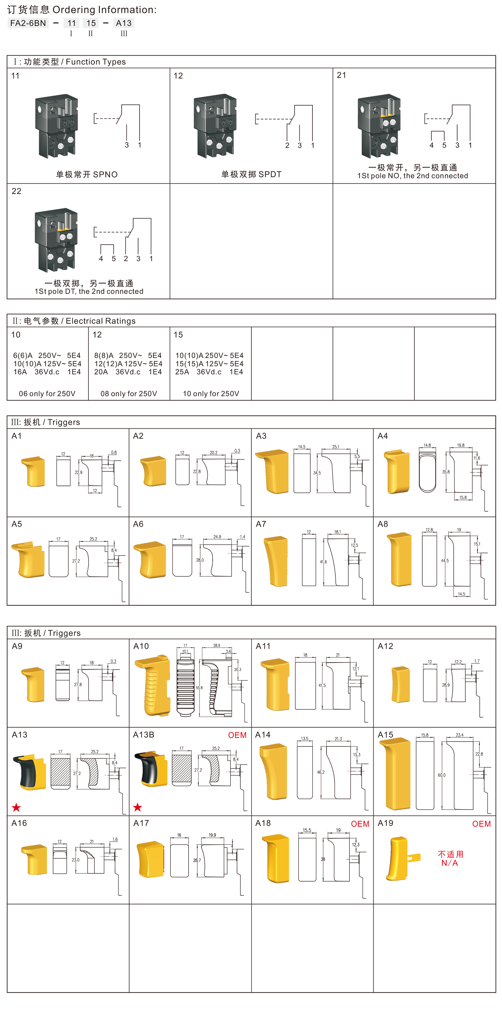 FA2-6BN系列是一款通用型的扳機開關, FA2-6B系列的防塵改進款,廣泛應用于各類電動工具,如:型材切割機、斜切鋸、電圓鋸、電錘、電鎬等。