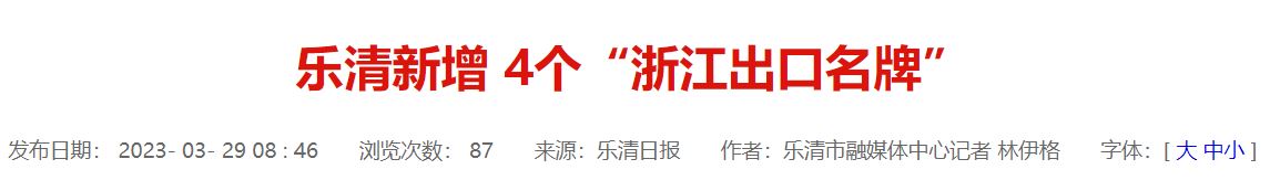 品牌是體現外貿高質量發展的重要標志。日前,浙江省商務廳公布了2022年度241個“浙江出口名牌”,其中樂清4個品牌上榜,數量居溫州之首。 “浙江出口名牌”的有效期為3年,本次公布的名單中,全省新增95個、復核146個。從我市情況來看,浙江創奇電子有限公司的“創奇CHAC”、浙江佳奔電子有限公司的“佳奔JIABEN”、紅光電氣集團有限公司的“紅光HOGN”、新亞電子股份有限公司的“新亞XINYA”等品牌為新增上榜品牌。