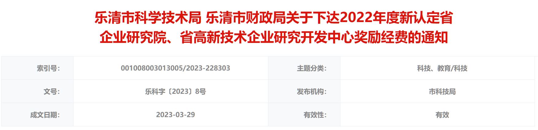 為了推動我市科技進步,加快區域科技創新體系建設,根據《樂清市人民政府關于印發<樂清市進一步推動工業經濟高質量轉型發展若干政策>的通知》(樂政發〔2022〕6號)、《關于印發<樂清市科技項目資金管理辦法>的通知》(樂科字〔2022〕32號)和《浙江省科學技術廳關于公布2022年度新認定省級企業研發機構名單的通知》……